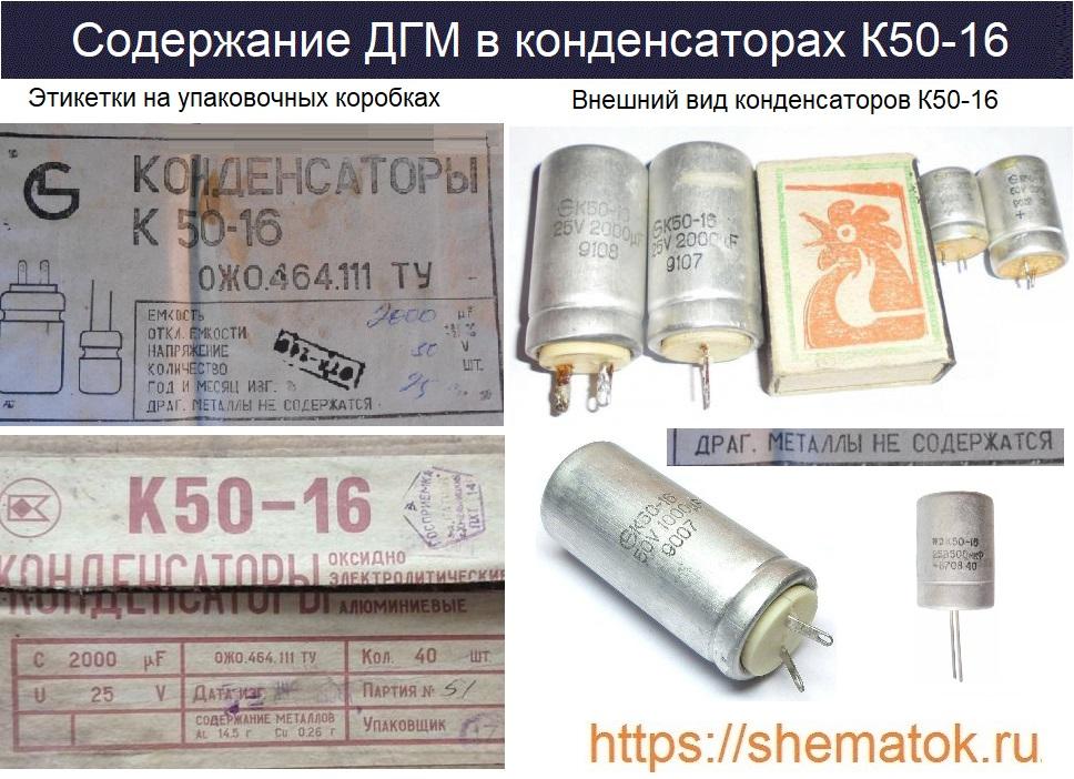Ранее, в старых технических паспортах на конденсатор К50-16, а также на этикетках картонных упаковок, в которых он продавался, делалась отметка об отсутствии ДГМ (см. фотографии выше). В настоящее время такие данные производители не предоставляют. Вместе с тем, стоит учитывать, что в одном изделии содержится много технического алюминия (Au), который также очень ценятся на рынке радиолома. Кроме Au в некоторых образцах может содержится медь (Сu), но её очень мало (до 0,25 г).