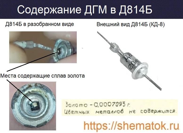Содержание драгметаллов в советском Д814Б незначительное. По данным предприятий, принимающих такие стабилитроны на переработку (аффинаж), в 1000 шт. присутствует от 0.67 до 0.73 г золота. Вместе с тем, не все изделия могут похвастаться даже таким скудным количеством ДГМ.