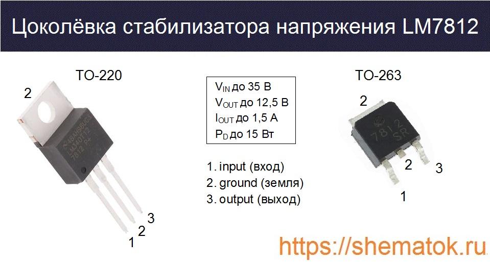 Распиновка LM7812 следующая. Этот стабилизатор производится преимущественно в пластиковом корпусе ТО-220. Металлические выводы, если смотреть слева на право, имеют назначение: input (вход), ground (земля), output (выход). Очень редко, но встречаются идентичные изделия в упаковке ТО-263.