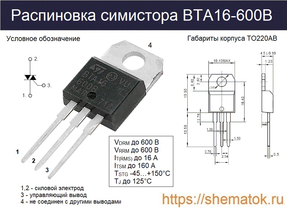 Производители выпускают BTA16-600B в корпусе ТО-220АВ. Если расположить симистор лицевой стороной к себе, то идущие вниз металлические выводы имеют следующее назначение: первый и второй – силовые электроды, третий – управляющий. Наглядно ознакомиться распиновкой и габаритами устройства можно по рисунку ниже.