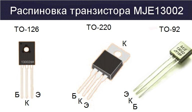 Транзистор 13002 (MJE13002) можно встретить в трех разных корпусах: ТО-126, ТО-220 и ТО-92. Если смотреть на изделия в ТО-126, ТО-220 со стороны маркировки, то расположение ножек, слева направо, будет таким: база (Б), коллектор (К), эмиттер (Э). В ТО-92 выводы расположены в обратном порядке- ЭКБ.цоколевка 13002