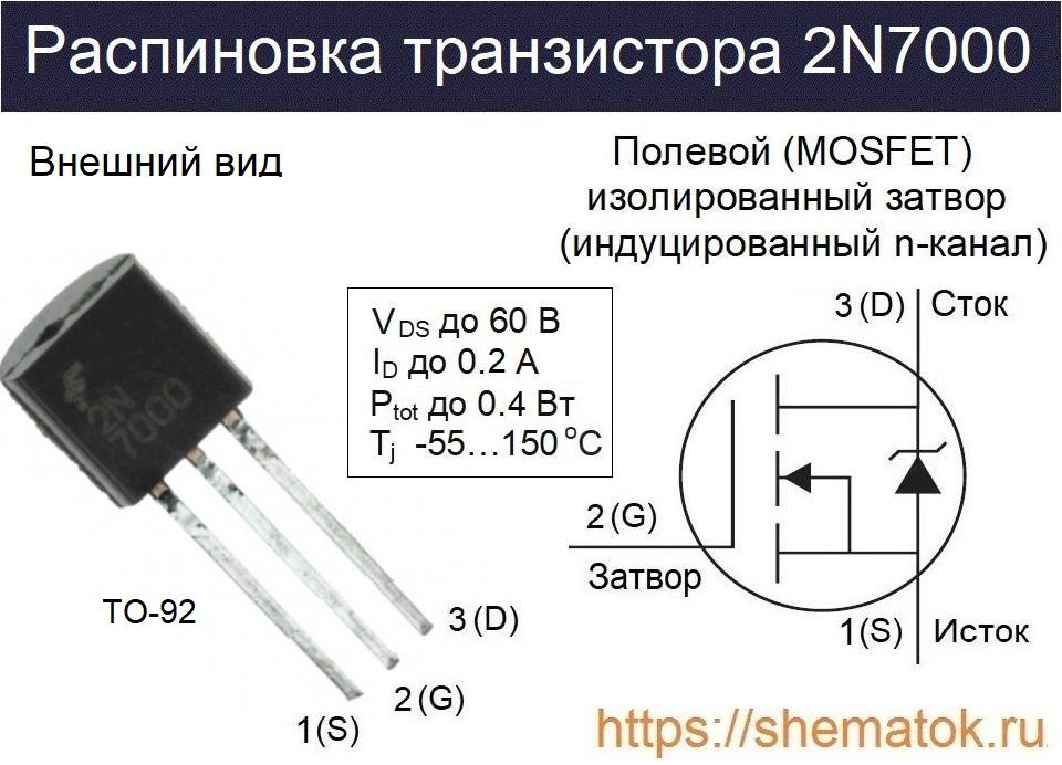 У 2N7000 в упаковке SOT-23 расположение выводов (слева на право): затвор, сток, исток.
