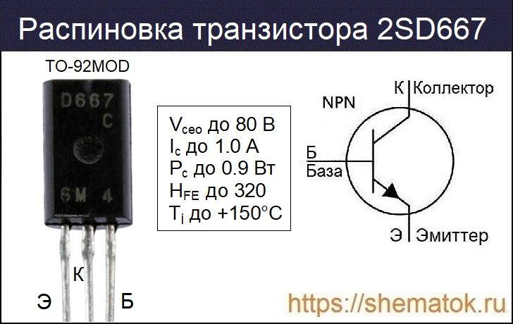 На внешней стороне корпуса у рассматриваемого транзистора чаще всего присутствует только маркировка D667. Первые два символа «2S», из полного обозначения, производители обычно не указывают. У более новых безсвинцовых устройств на пластиковой упаковке в большинстве случаев имеется буква «P», у безгалогенных – «HF» (в соответствии с европейским экологическим стандартом RoHS).
