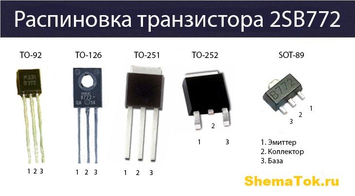 Изготавливается 2SB772 в корпусах для дырочного монтажа: ТО-92, ТО-126, ТО-251 и ТО-252. Есть также модификации этого транзистора для навесного SMD монтажа в оболочке SOT-89. Часто производители не наносят на корпусе первую цифру и букву, а маркируют их как «B772» Расположение и назначение выводов для всех корпусов представлено на рисунке.