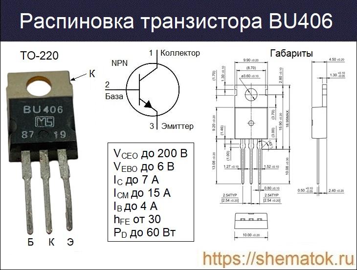 Основные производители выпускают BU406 в корпусе ТО-220 и его различных модификациях. При этом, порядок расположения металлических выводов для дырочного монтажа на плату (слева на право): база (Б), коллектор (К) и эмиттер (Б). На рисунке ниже можно ознакомиться с внешним видом устройства, назначением и размещением его контактов (распиновкой), основными параметрами и внешними габаритами.
