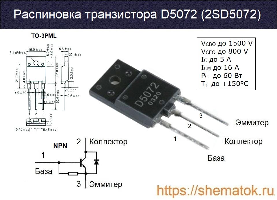 Полное обозначение рассматриваемого транзистора «2SD5072». Однако в маркировке, имеющейся на его корпусе, нет двух первых символов «2S».