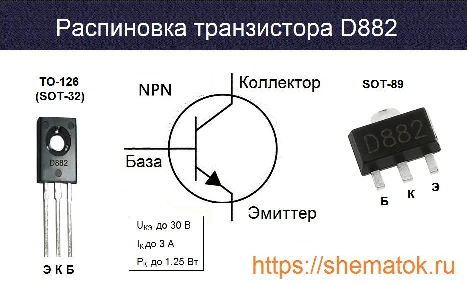Цоколевка транзистор d882 выполнена в пластмассовом корпусе ТО-126. Европейская компания STMicroelectronics выпускает его в похожей по параметрам фирменной упаковке с наименованием SOT-32. Слева на право: эмиттер (Э), коллектор (К), база (Б).