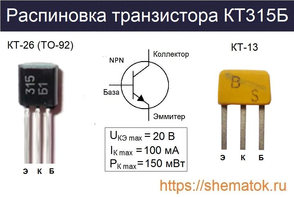 Цоколевка современного КТ315Б, выпускаемого в наши дни преимущественно выполнена в корпусе ТО-92 (отечественный КТ-26), имеет следующий вид. Эта стандартная пластиковая упаковка для подобных транзисторов имеющая три гибких металлических вывода. Если смотреть на её маркировку, то первая левая ножка — это эмиттер (Э), следующая – коллектор (К) и последняя – база (Б). Такое назначение контактов характерно для всех групп устройств серии КТ315, независимо от их корпусного исполняя – Э.К.Б.