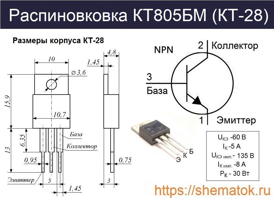 КТ805БМ производится в пластиковой упаковке КТ-28 (аналог ТО-220). Имеет три гибких контакта с назначением (слева на право): эмиттер (Э), коллектор (К), база (Б). Вес – не более 2.5 гр.