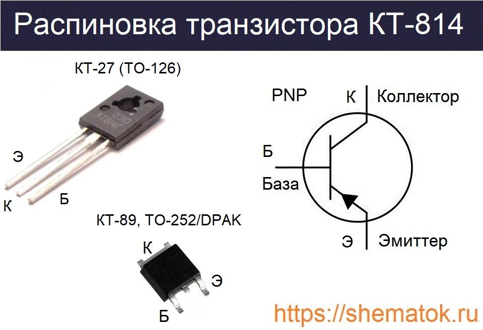 Цоколевка кремниевых транзисторов КТ814 зависит от корпуса, в котором он расположен. Чаще всего данную серию производят в стандартных пластиковых упаковках ТО-126 (российский аналог — КТ-27). Устройство имеет три гибких вывода, расположенных в следующем порядке (слева направо): эмиттер (Э), коллектор (К), база (б). Внешний вид, размеры и распиновка представлены на рисунке.