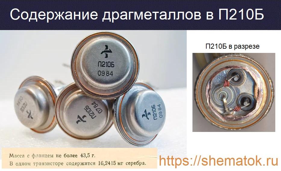 Информации о содержание драгметаллов (ДГМ) в транзисторах П210Б в справочной литературе на данную тему немного. В большинстве источников указано на наличие в них серебра (Ag) до 16,2415 мг. Золото и другие металлы платиновой группы (МПГ) отсутствуют.