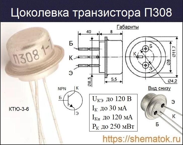Цоколевка П308 зависит от корпуса, в котором изготовлен транзистор. Наиболее распространённым является вариант в металлостеклянной упаковке КТЮ-3-6 (в климатическом исполнении УХЛ), выпускавшийся по техусловиям 3.365.059 ТУI. Расположение гибких металлических выводов у него следующее (слева на право): база (Б); ниже, посередине — коллектор (К); эмиттер (Э). Более подробно информация показана на изображении ниже.