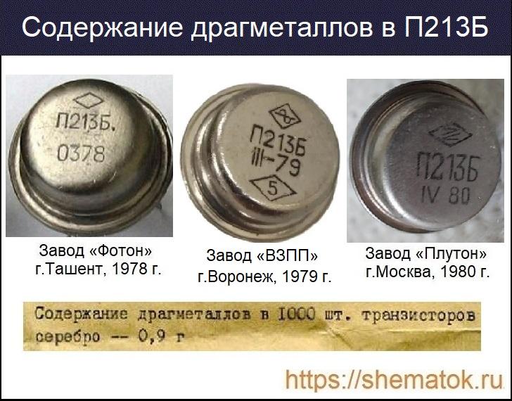 Содержание драгметаллов в германиевом транзисторе П213Б незначительное. Можно сказать, что ДГМ в них практически полностью отсутствуют, за исключением небольшого количества серебра (информация приведена на изображении). Cобирать их для сдачи на переработку, в том числе в качестве лома, считается нецелесообразным.