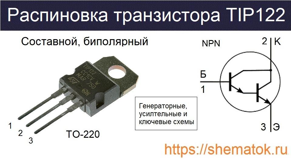 Цоколевка TIP122, если смотреть на транзистор со стороны маркировки, следующая: первая ножка слева — база, вторая — коллектор, третья — эмиттер. Выпускаются исключительно в пластмассовом корпусе TO-220 с жесткими выводами. Может встречается в полностью закрытом TO-220FP и более современном TO-220AB.